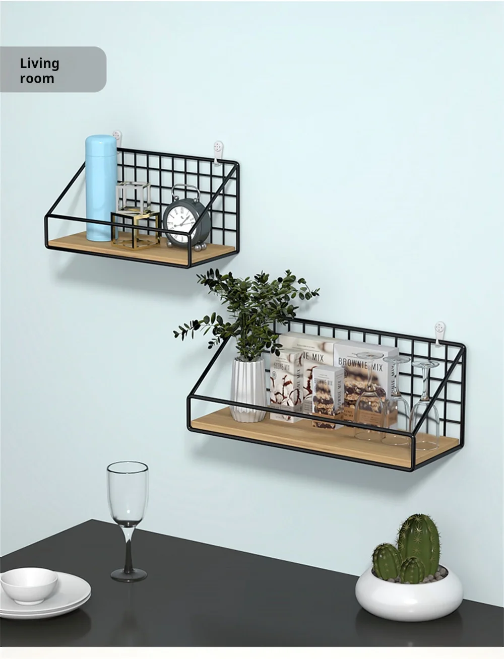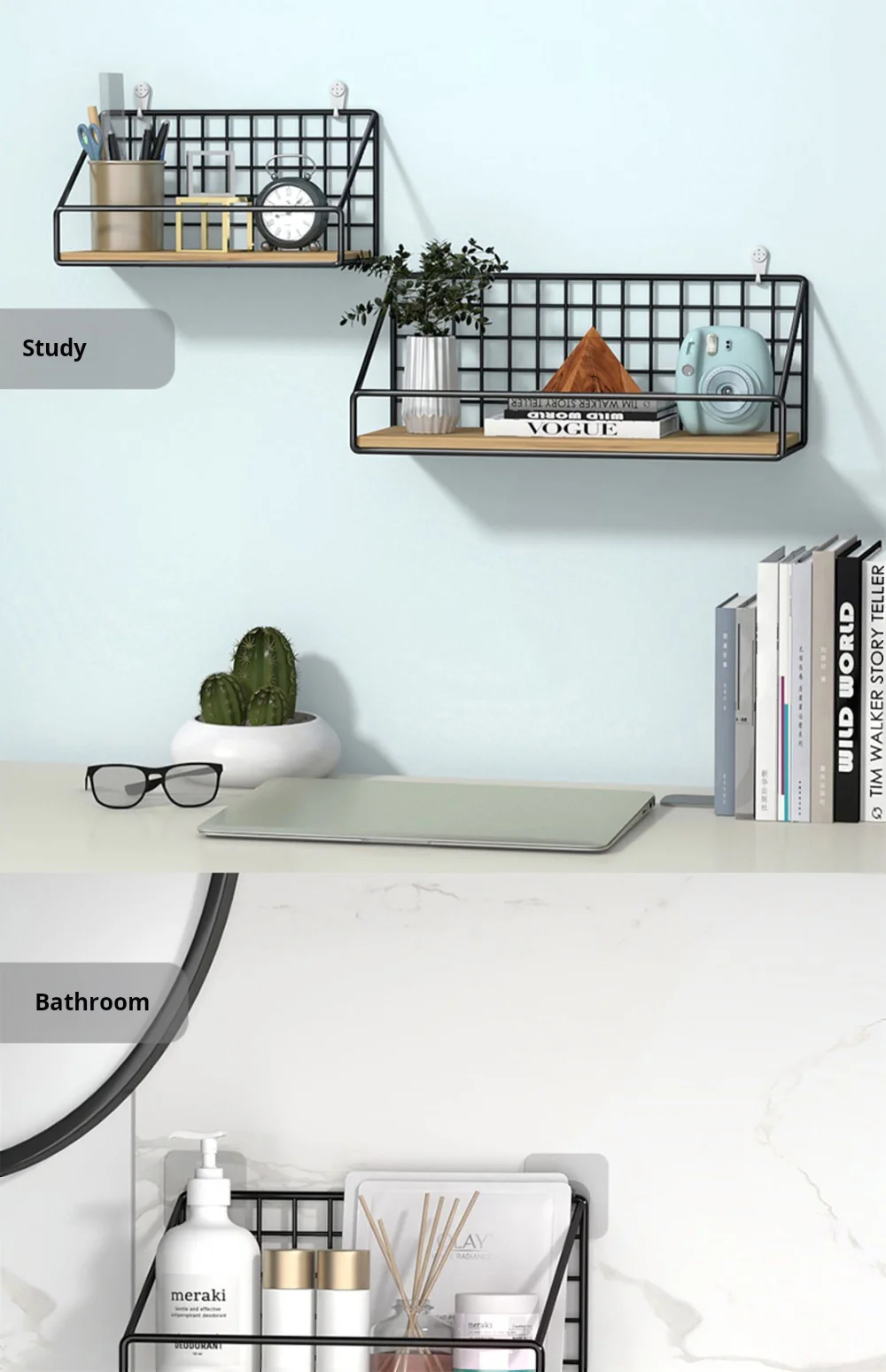 【رف متعدد الوظائف】 - استفد بشكل كامل من المساحة الحرة على الحائط.مجموعة الرف العائمة ذات الإطار السلكي المعدني الأسود مناسبة جدًا لمطبخك، وغرفة المعيشة، وغرفة النوم، والحمام، والمكتب، إلخ.